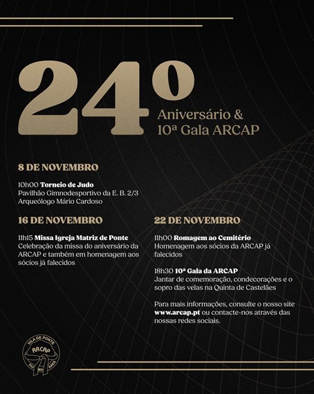 O ponto alto das celebrações ocorrerá também no dia 22 de novembro, às 18h30, com a 10.ª Gala da ARCAP, que incluirá um jantar comemorativo, entrega de condecorações e o tradicional sopro das velas. O evento terá lugar na Quinta de Castelães.