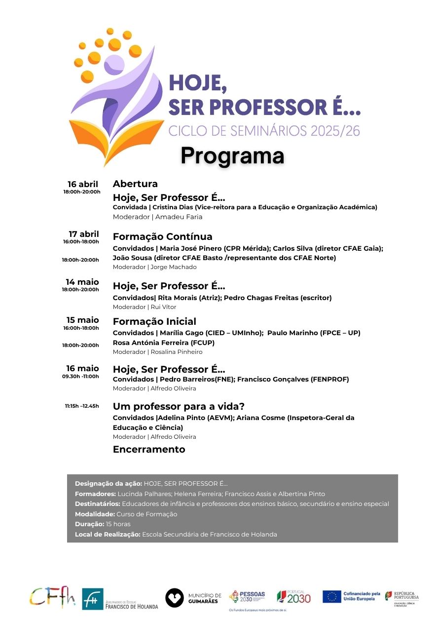 A iniciativa, que decorre nas instalações da Escola Secundária Francisco de Holanda, começou pelas 18h00 através do seminário "Hoje, Ser Professor É...", com a intervenção de Cristina Dias, vice-reitora da Universidade do Minho para a Educação e Organização Académica.