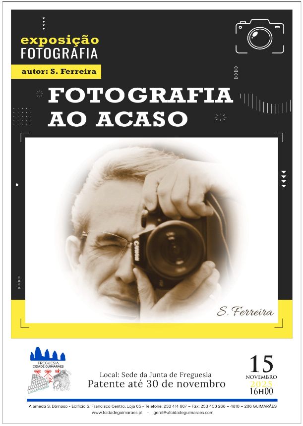 A sede da Junta da União de Freguesias de Oliveira, São Paio e São Sebastião, situada no Centro Comercial São Francisco, acolhe, a partir do dia 15 de novembro, pelas 16h00, a inauguração da exposição de fotografia "Fotografia ao Acaso", da autoria de Secundino Ferreira.