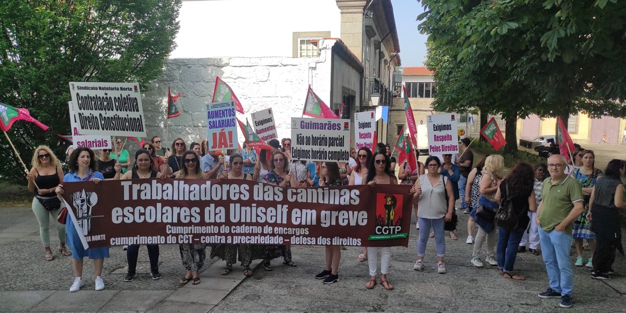 “Muitas [funcionárias] trabalham poucas horas diárias, cujo valor que recebem não chega para pagar os transportes, não estão devidamente classificadas, recebem salários baixos, a empresa e a associação patronal recusam negociar melhores salários e a revisão do Contrato Coletivo de Trabalho, e a Câmara Municipal de Guimarães não fiscaliza o Caderno de Encargos”, lia-se. Um horário completo de 40 horas semanais para os trabalhadores das cantinas de confeção, carga horária mínima de quatro horas diárias e 20 horas semanais para os trabalhadores das cantinas transportadas são outras das reivindicações.